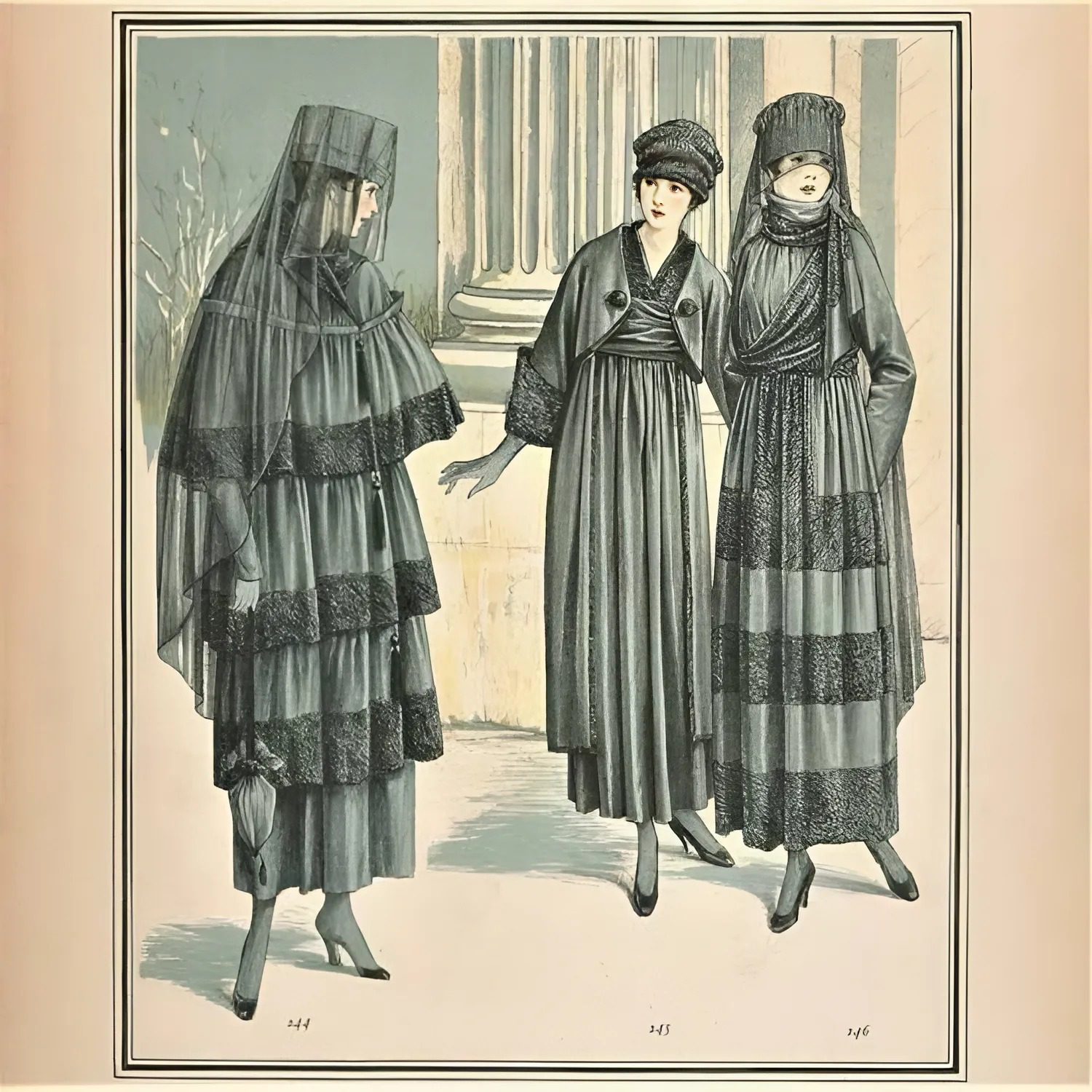 Многие женщины теряли на войне мужей, женихов и братьев. Поэтому на страницах печатных изданий было много фасонов закрытых черных платьев, шляпок с вуалью — одежды для вдов. Главным цветом в военный период стал черный. О вышивке и кружевах, которые были очень популярны раньше, почти никто и не вспоминал.