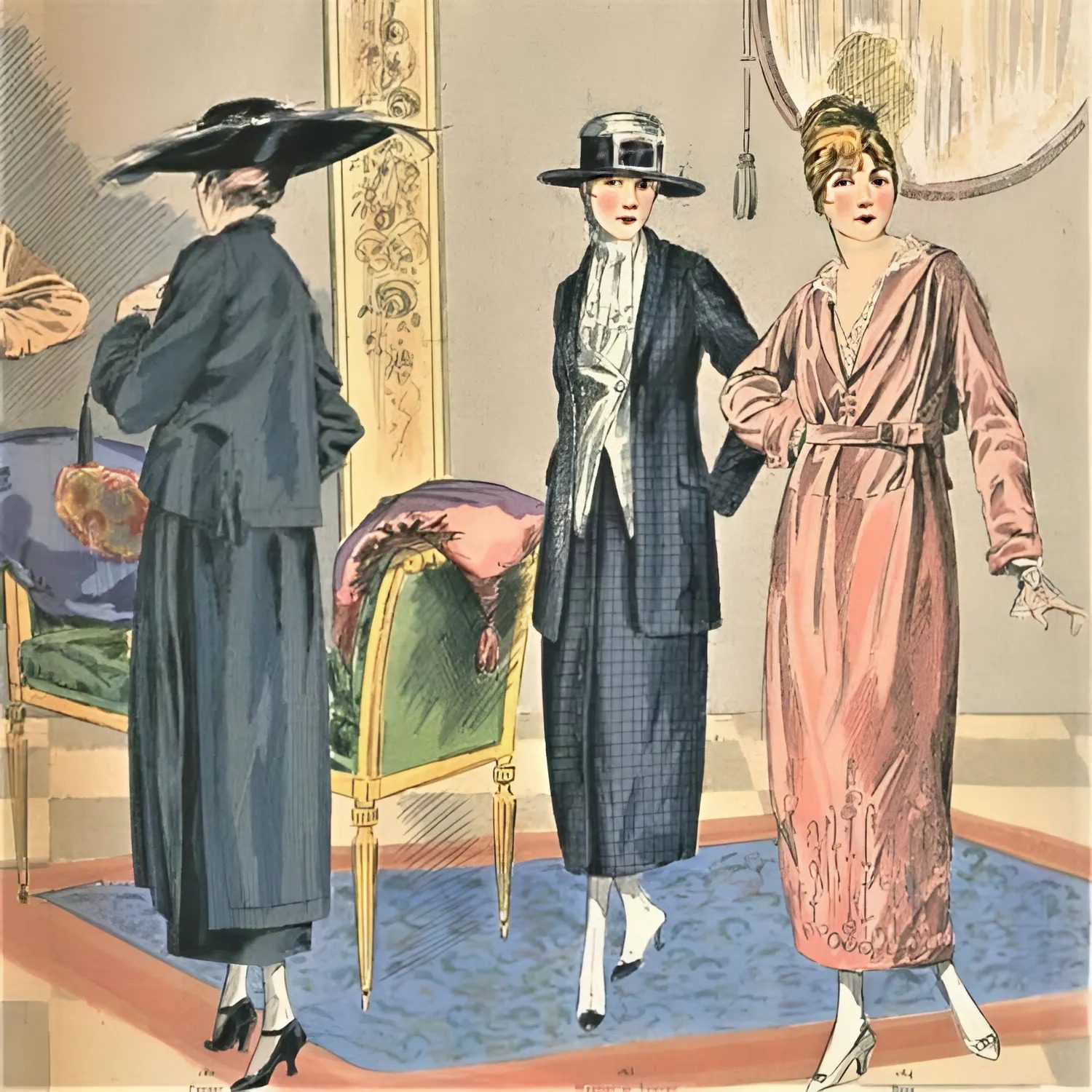 В 1915 году мода ненадолго становится более романтичной. Барышни одевались в «военный кринолин»: юбочку до икр, состоящую из большого количества ткани, которая накладывалась на несколько нижних юбок. Эта модель была ностальгическим напоминанием о кринолине, который одевали в XIX веке.
