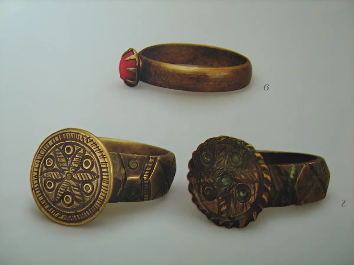 - Перстни со щитком. Имели круглый или прямоугольный щиток, часто составленный из нескольких кругов-розеток. Украшали кольцо гравировкой обычно с геометрическими орнаментами.