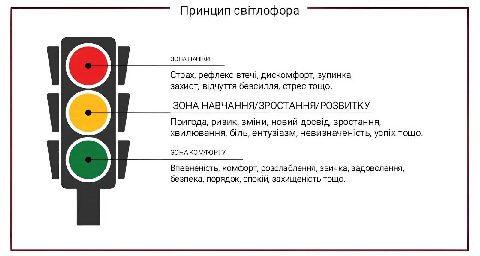Важно, чтобы выход из зоны комфорта был осознанным и осторожным, без травматизации и лишнего стресса (помним 3 зоны светофора).