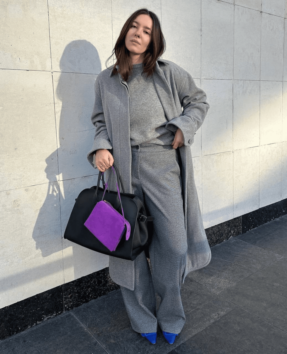 • Контраст насыщенности – экспериментируйте, комбинируя яркие и приглушенные цвета, например, приглушенно-фиолетовые брюки и ярко-зеленая сумка.