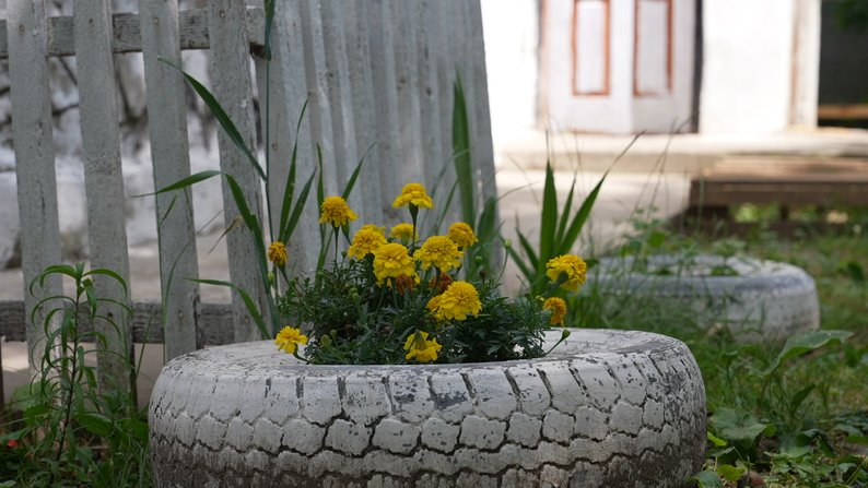 Для декоративного оформления двора он изготовил оригинальные украшения из старых автомобильных шин — очистил их, покрасил и расставил по участку, создав живописные акценты. Среди цветов, которые посадил Мустафа, особенно выделяются бархатцы — яркие, ароматные, они добавили красок и настроения саду. Также он сделал маленький заборчик, который гармонично вписывается в общую атмосферу сельского подворья.