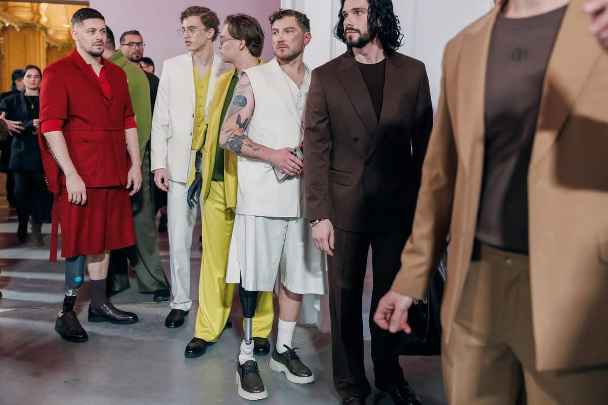 Дизайнери інтегрували в образи не лише символізм, а й реальну функціональність: піджаки зі знімними рукавами, приховані магнітні застібки, бокові шви на штанах, що полегшують одягання для людей з ампутаціями. Це вже другий спільний показ бренду з учасниками проєкту Revived Soldiers Ukraine, але саме FW25-26 запам’ятався особливою потужністю образів і глибоким меседжем — “Мода як підтримка і зброя”.