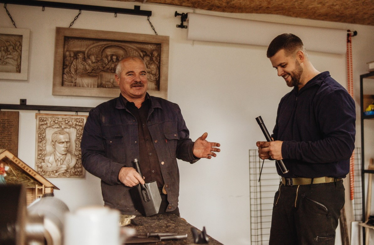 З початком повномасштабної війни Іван Деренько і його син Віталій знайшли спосіб допомагати захисникам України не лише словом підтримки, а й власними руками. Їхні вироби стали учасниками благодійних аукціонів по всій країні. Крім саперних лопаток, які майстри регулярно виготовляють для фронту, вони передають на торги унікальні різьблені шедеври, завдяки яким уже вдалося зібрати понад 700 тисяч гривень для різних бойових підрозділів.